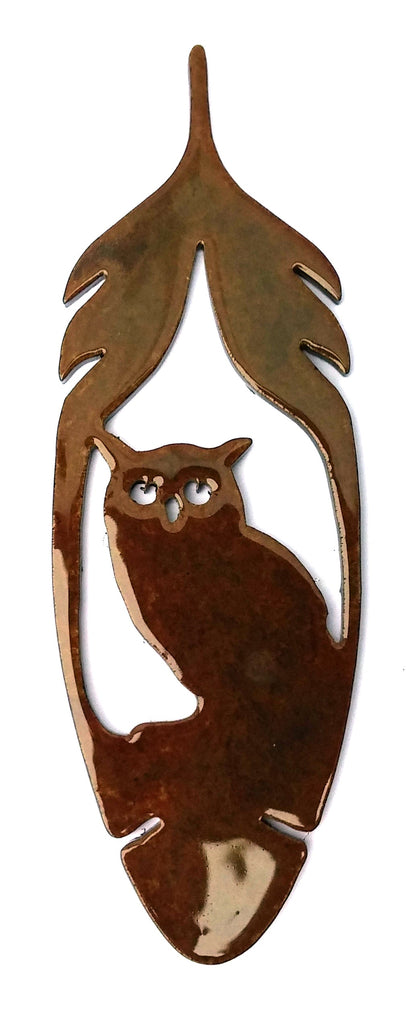 1.5 x 4.5" laser-cut steel magnet. The Feather Owl Magnet is stone tumbled and finished with our proprietary metal patina treatment. Clear coated with durable auto clear-coat. A strong rare Earth magnet is mounted on the back. Slight variations in color add to the aesthetic of this unique magnet.