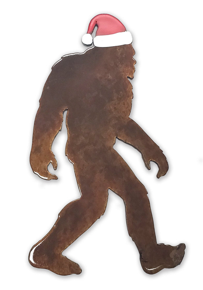 Celebrate the holidays with Bigfoot. Laser-cut steel with colored patina applied. Strong Rare Earth magnet glued on the back. Each one is unique. Hand painted hat on this guy. Designed and crafted in the USA. 3.9 x 2.2 inches