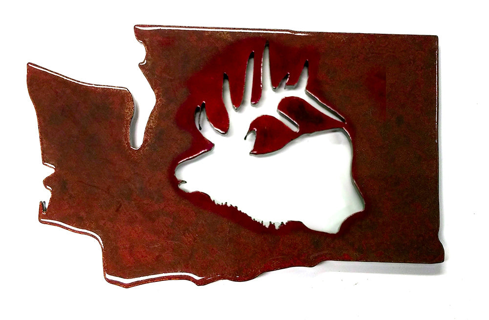 Laser-cut steel, stone tumbled and finished with Squatch Metalworks proprietary distressed metal patina treatment and clear coated with durable auto clear-coat. A very strong Rare Earth Magnet is glued on the back. Variations in the color add interest and beauty to these unique magnets. DESIGNED AND MADE IN THE USA